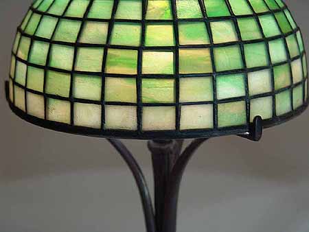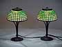 A Pair of 8" Geometric Tiffany Leaded Glass shades #1568-8 on Leaf Bronze Tiffany Lamp Bases # 426
