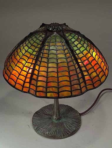 15" Spider Tiffany Lamp #1424 on Mushroom Bronze lamp base #337