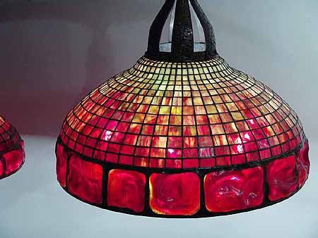 The lamp shades are available as single hanging lamp also and as a table lamp in combination with a bronze lamp base. A two light combination of 2X 19" shades is available also. There is one triple light Pool table lamp