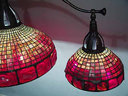 There is one triple light Pool table lamp known made by Tiffany Studios NY, which has this geometric design with Turtleback tile bands.