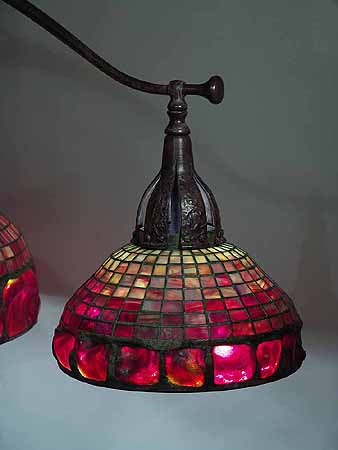 There is one triple light Pool table lamp known made by Tiffany Studios NY, which has this geometric design with Turtleback tile bands.