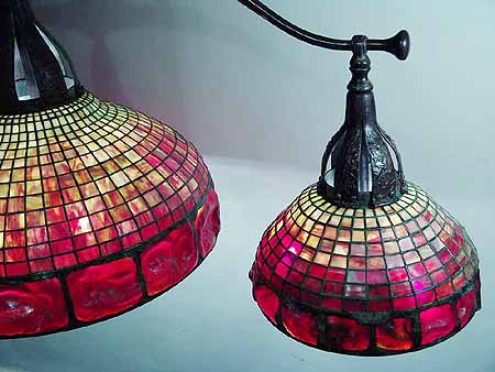 There is one triple light Pool table lamp known made by Tiffany Studios NY, which has this geometric design with Turtleback tile bands.