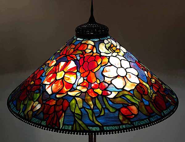 29" Peony leaded glass and bronze Tiffany lamp #603 on Piano Junior Floor base #387