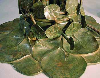 The suface of the lamp base and sockets are patinated with  green- brown Tiffany patina made in our Studio using the original recipe handed down by Tiffany Studios New York. No lacquer is used in the patination process.