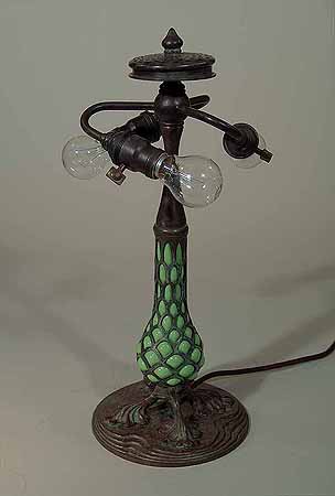 This base is wired according to US safety standards. It comes ready to use in the USA with new old style cloth covered lamp cord and standard US lamp sockets. Other standards of electrification are available at no extra cost. The suface of the lamp base and sockets are patinated with brown /dark green- brown Tiffany patina made in our Studio using the original recipe handed down by Tiffany Studios New York. No lacquer is used in the patination process.