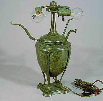 This base is wired according to US safety standards. It comes ready to use in the USA with new old style cloth covered lamp cord and standard US lamp sockets. Other standards of electrification and other colors of patination are available at no extra cost. The suface of the lamp base and sockets are patinated with green- brown Tiffany patina made in our Studio using the original recipe handed down by Tiffany Studios New York. No lacquer is used in the patination process.