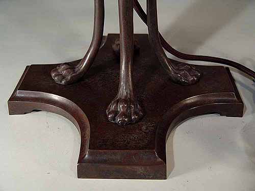 Other standards of electrification are available at no extra cost. The suface of the lamp base and sockets are patinated with brown /dark green- brown Tiffany patina made in our Studio using the original recipe handed down by Tiffany Studios New York. No lacquer is used in the patination process.