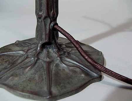 The suface of the lamp base and sockets are patinated with brown /dark green- brown Tiffany patina made in our Studio using the original recipe handed down by Tiffany Studios New York. No lacquer is used in the patination process.