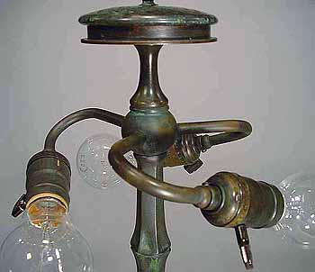 This base is wired according to US safety standards. It comes ready to use in the USA with new old style cloth covered lamp cord and standard US lamp sockets. Other standards of electrification are available at no extra cost. The suface of the lamp base and sockets are patinated with brown /dark green- brown Tiffany patina made in our Studio using the original recipe handed down by Tiffany Studios New York. No lacquer is used in the patination process.