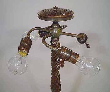 This base is wired according to US safety standards. It comes ready to use in the USA with new old style cloth covered lamp cord and 4 standard US lamp sockets. Other standards of electrification are available at no extra cost. The suface of the lamp base and sockets are patinated with brown /dark green- brown Tiffany patina made in our Studio using the original recipe handed down by Tiffany Studios New York. No lacquer is used in the patination process.